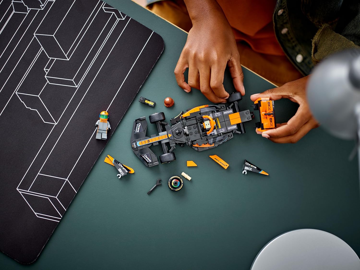• The LEGO Speed Champion Mc Laren Formula 1 racing car 2023 features a black and orange lacquer coating, team sponsor logos, Pirelli printed tyres and orange cockpit protection